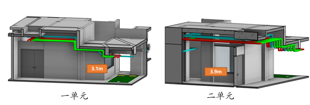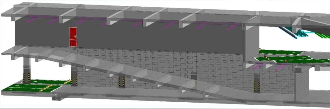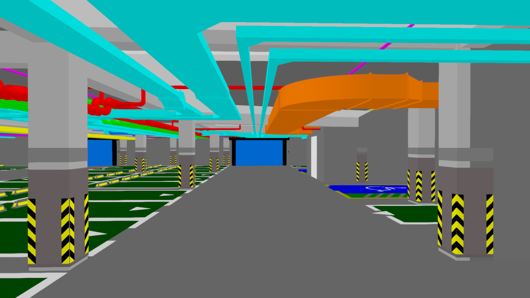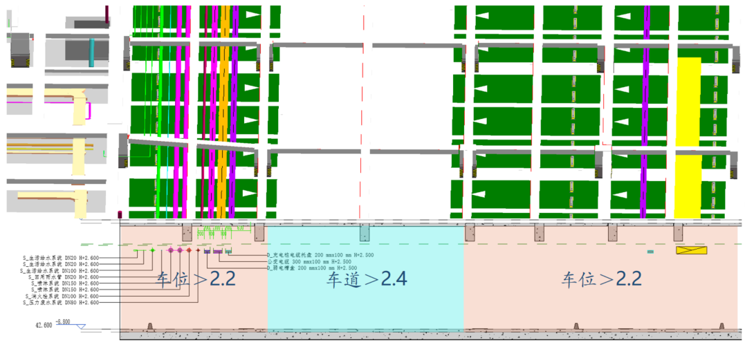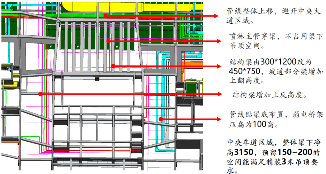 车道优化:同专业管线集中布置,调整平行车道管线至车位,保证车道净高大于2.4米,车位净高大于2.2米。