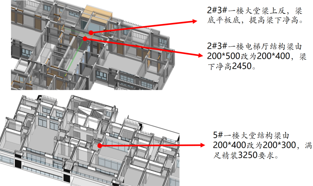 入户大堂优化:合用前室梁下净高3100,无法满足吊顶3米要求,结构优化梁截面,由400改为300高,调整后梁下3200,梁下走桥架,满足吊顶要求。