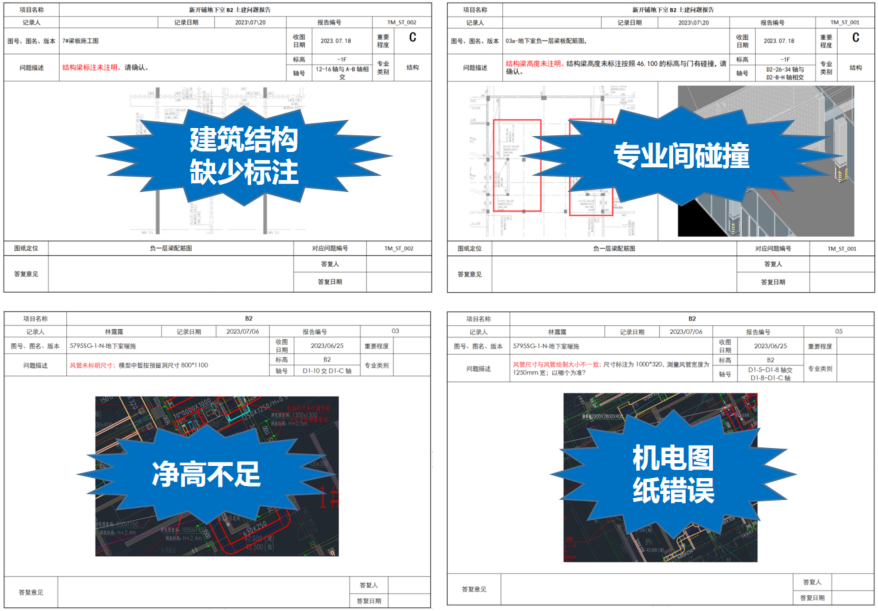 通过对全专业建模,对图面问题、碰撞问题、净高问题进行排查,形成问题记录,跟踪问题解决情况,确保在设计阶段将问题前置,解决问题。