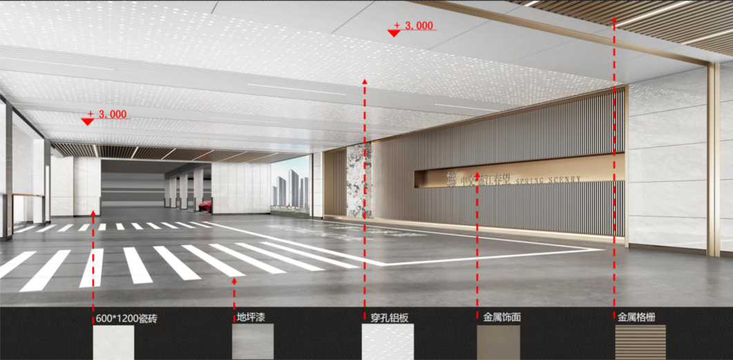 入户区域以及车道落客区全部吊顶,为满足吊顶净高要求,对结构、管线路由进行了调整,保证每栋楼归家动线吊顶高度满足要求,提高归家舒适度。