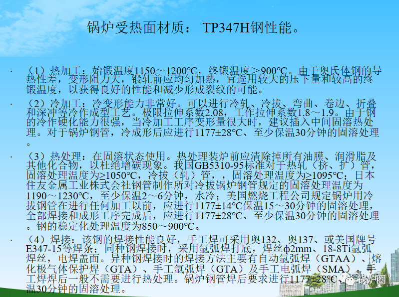 TP347H:也是ASME SA-213中的钢号,为铬镍铌奥氏体不锈钢;我国GB5310-95将该钢列入其中,牌号为1Cr19Ni11Nb, 此钢也为成熟钢种。由于该钢是用铌稳定的奥氏体钢,故其具有较好的抗晶间腐蚀性能、较高的持久强度、良好的组织稳定性和抗氧化性能,此外还具有良好的弯管 和焊接性能;其综合性能优于TP304H。但由于合金元素较多,与TP304H一样,容易产生加工硬化,使切削加工较难进行;其热膨胀系数高,导热性差;故在与异种钢焊接并在高温下使用时,须考虑两种材料的膨胀系数和高温强度匹配问题。TP347H钢管性能优良。主要用于制造亚临界、超临界压力参数的大型 发电锅炉的高温过热器、高温再热器、屏式过热器的高温段以及各种耐高温高压的管件等部件;对于承压部件,最高工作温度可达650℃;对于抗氧化部件,其最 高抗氧化使用温度可达850℃。但由于具有奥氏体钢所具有的缺点,此种耐热钢用于承压部件上时,同样有可能在某种程度上,被T92和HCM12A部分替代