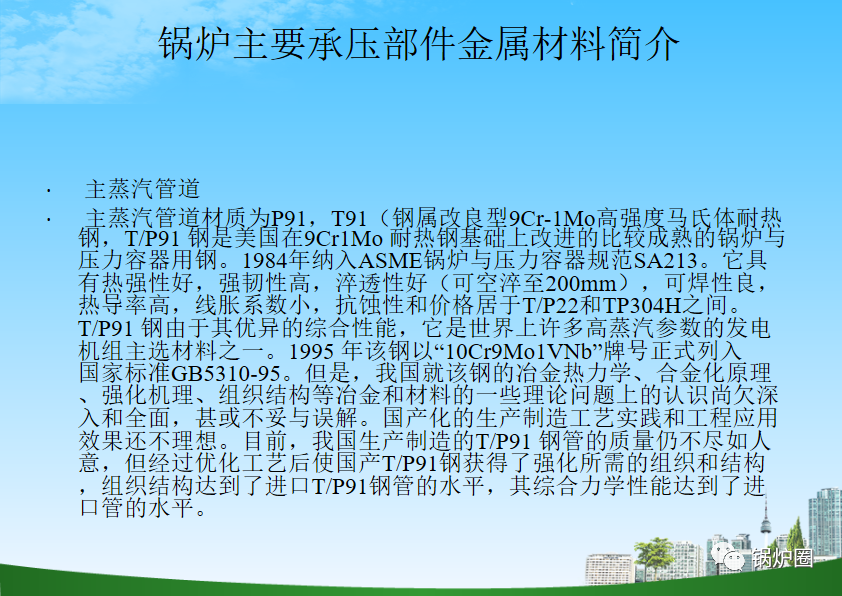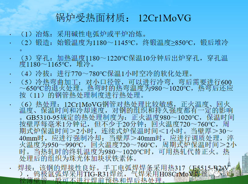 12Cr1MoVG:是 GB5310-95的列标钢,是国内高压、超高压、亚临界电站锅炉过热器、集箱和主蒸汽导管广泛采用的钢种。化学成分和力学性能与12Cr1MoV板材基 本相同。其化学成分简单,总合金含量在2%以下,为低碳、低合金的珠光体型热强钢。其中的钒能与碳形成稳定的碳化物VC,可使钢中的铬与钼优先固溶存在于 铁素体中,并减慢了铬和钼从铁素体到碳化物的转移速度,使钢在高温下更为稳定。此钢中的合金元素总量只有国外广泛使用的2.25Cr-1Mo钢的一半,但 在580℃、10万h的持久强度比后者却高40%;而且其生产工艺简单,焊接性能良好,只要严格热处理工艺,就能得到满意的综合性能和热强性能。电站实际 运行表明:12Cr1MoV主蒸汽管道在540℃安全运行10万h后,仍可继续使用。其大口径管主要用作蒸汽参数565℃以下的集箱、主蒸汽导管等,小口 径管用于金属壁温580℃以下的锅炉受热面管等。