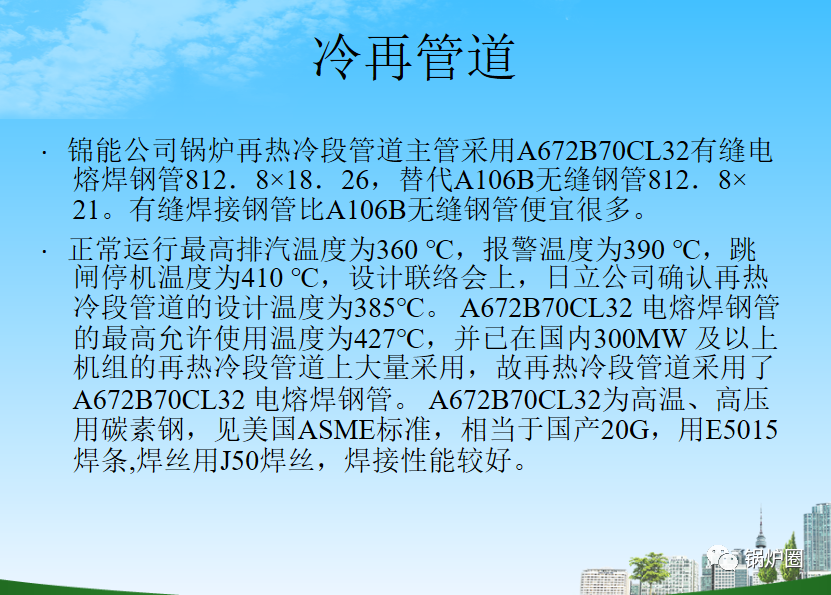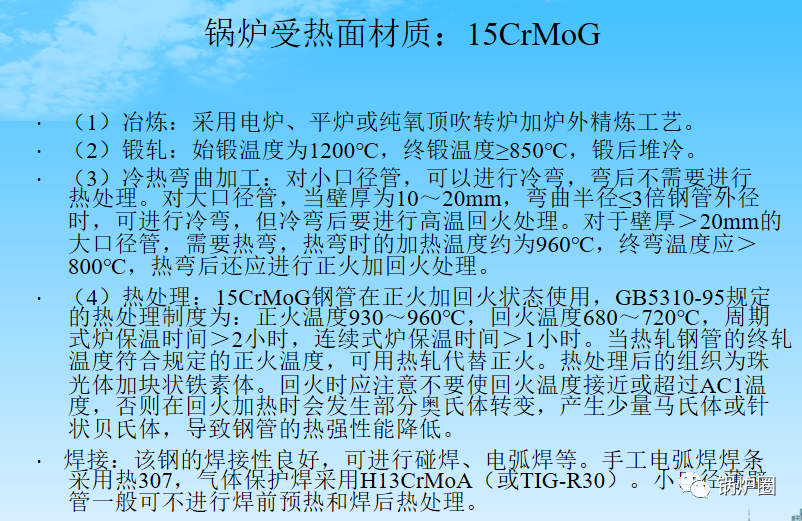 20G:是GB5310-95的列标钢号(国外对应牌号:德国的st45.8、日本的STB42、美国的SA106B), 为最常用的锅炉钢管用钢,化学成分和力学性能与20板材基本相同。该钢有一定的常温和中高温强度,含碳量较低,有较佳的塑性和韧性,其冷热成型和焊接性能 良好。其主要用于制造高压和更高参数的锅炉管件,低温段的过热器、再热器,省煤器及水冷壁等;如小口径管做壁温≤500℃的受热面管子、以及水冷壁管、省 煤器管等,大口径管做壁温≤450℃的蒸汽管道、集箱(省煤器、水冷壁、低温过热器和再热器联箱),介质温度≤450℃的管路附件等。由于碳钢在450℃ 以上长期运行将产生石墨化,因此作为受热面管子的长期最高使用温度最好限制到450℃以下。该钢在这一温度范围,其强度能满足过热器和蒸汽管道的要求、且 具有良好的抗氧化性能,塑性韧性、焊接性能等冷热加工性能均很好,应用较广。此钢在伊朗炉(指单台)上所使用的部位为下水引入管(数量为28吨)、汽水引 入管(20吨)、蒸汽连接管(26吨)、省煤器集箱(8吨)、减温水系统(5吨),其余作为扁钢、吊杆材料使用(约86吨)。