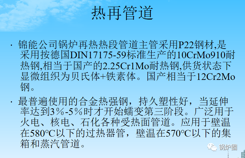 T122(HCM12A):是日本住友金属株式会社以德国X20CrMoV121为基研制的HCM12(HCM12 中,降低了X20CrMoV121的碳含量,在钢中加入1%的W和少量的Nb,形成W-Mo的复合固溶强化和更加稳定的细小碳化铌弥散沉淀强化,提高组织 稳定性和高温强度)的基础上,进一步调整成分:提高W含量至2%左右、降低Mo含量至0.25-0.60%,还加入1%左右的Cu和微量N 、B,形成以W为主的W-Mo复合固溶强化、氮的间隙固溶强化、铜相和碳氮化物的弥散沉淀强化的多种强化,从而研制而成的12%Cr的低碳合金耐热钢。在 正回火状态下钢中的主要沉淀相为VC、VN,M23C6。近年由ASME Code Case 2180-2批准,牌号定为T122。T122(HCM12A)钢时效前后的力学性能差异很小;金相组织类同母材的原始组织;时效对冲击韧性有一定影响,但经长期时效后仍具有一定的冲击韧性;焊接性能良好;并具有较高的组织稳定性和高温强度、抗氧化性能和抗腐蚀性能。与 T91相比,其在高温650℃时的持久强度{许用应力}、抗氧化性能和抗腐蚀性能更优;与奥氏体不锈钢相比,奥氏体不锈钢在高温下的持久强度{许用应力} 和抗氧化性能虽优于HCM12A,但奥氏体钢的应力腐蚀或晶间腐蚀却是一个难题。用HCM12A无此类问题。T122(HCM12A)钢管性能优良。该钢 的最高使用温度为650℃。完全可用于制造先进的超临界锅炉机组的材料,可用于制造大型电站锅炉金属壁温不超过650℃的过热器和再热器。该钢在 600-650℃的锅炉过热器和再热器上可部分代替TP304H和TP347H,具有良好的经济价值。